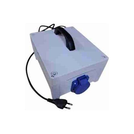 Transformator separacyjny o mocy 800VA do zasilania elektronarzędzi i innych jednofazowych odbiorników napięciem 230V, w obudowie ABS IP65, z gniazdem 16A IP54 i kablem zasilającym długości 1m z wtyczką.